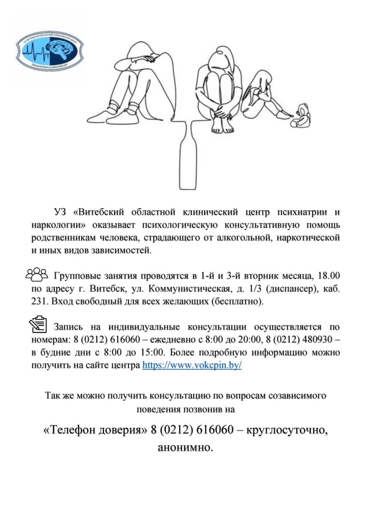 | 4. | УЗ «Витебский областной клинический центр психиатрии и наркологии» | +375 (212) 61-60-60 | Круглосуточно | Витебский район, п. Витьба, ул. Центральная 1А |